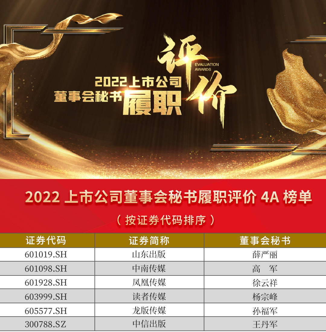 12月12日,中国上市公司协会发布“2022上市公司董事会秘书履职评价”结果。全国出版业27家上市公司中,龙版传媒和中南传媒、凤凰传媒、山东出版、读者传媒、中信出版6家公司荣获4A级评价。黑龙江辖区40家上市公司中2家公司荣获4A评级,2家公司获得3A级评级。